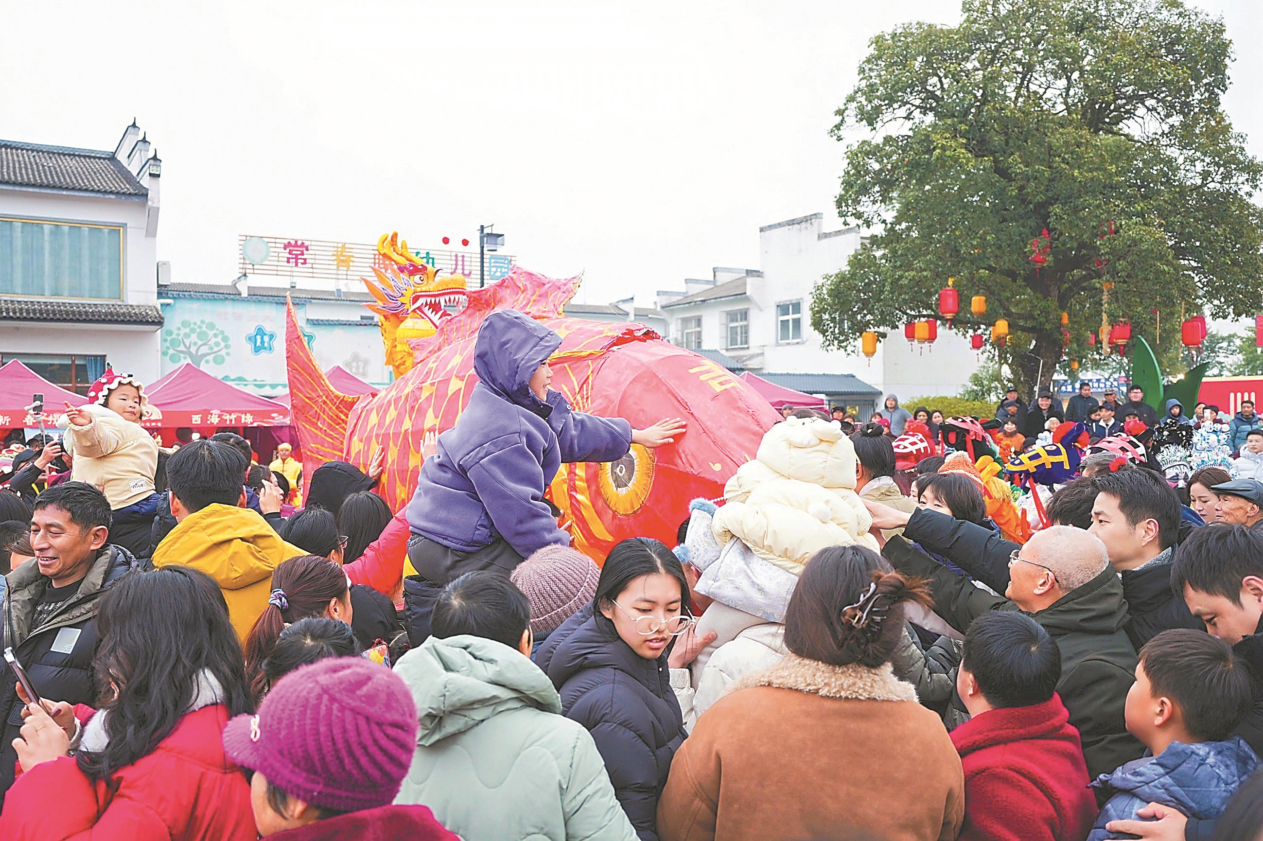 2月17日,在黄山市黄山区六角楼广场举办的“火马太平年”活动上,一名儿童怀着期待,触摸吉庆鱼灯的“鱼头”。 黄山市黄山区融媒体中心供图