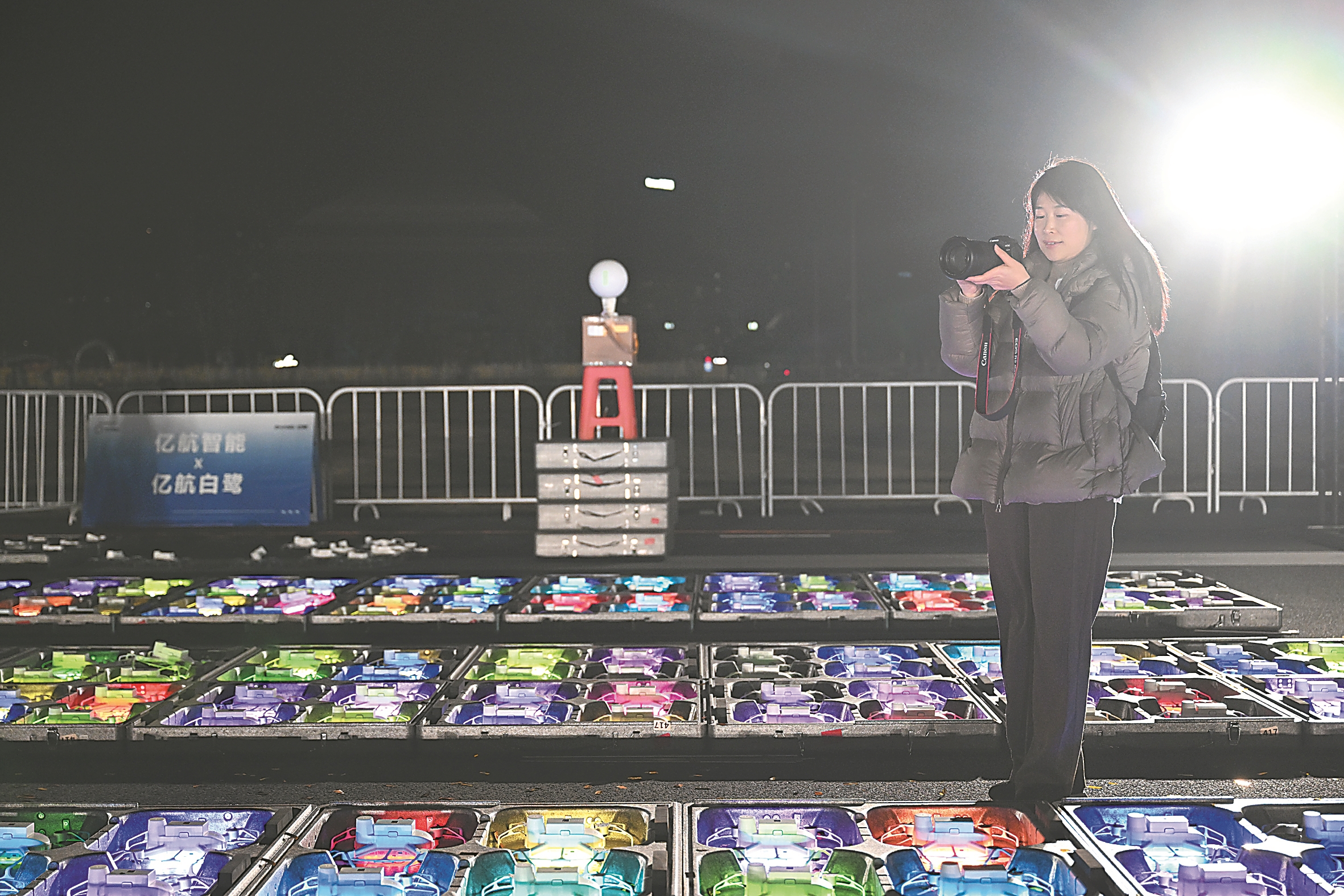 记者王兰兰在合肥骆岗公园采访总台春晚合肥分会场无人机彩排。