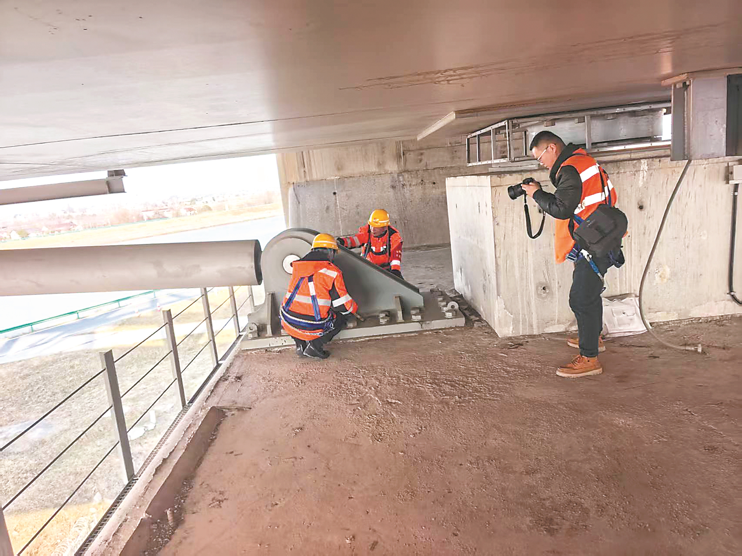 记者关敬生深入裕溪河特大桥,采访春运期间桥梁检养工作队一线巡检工作。