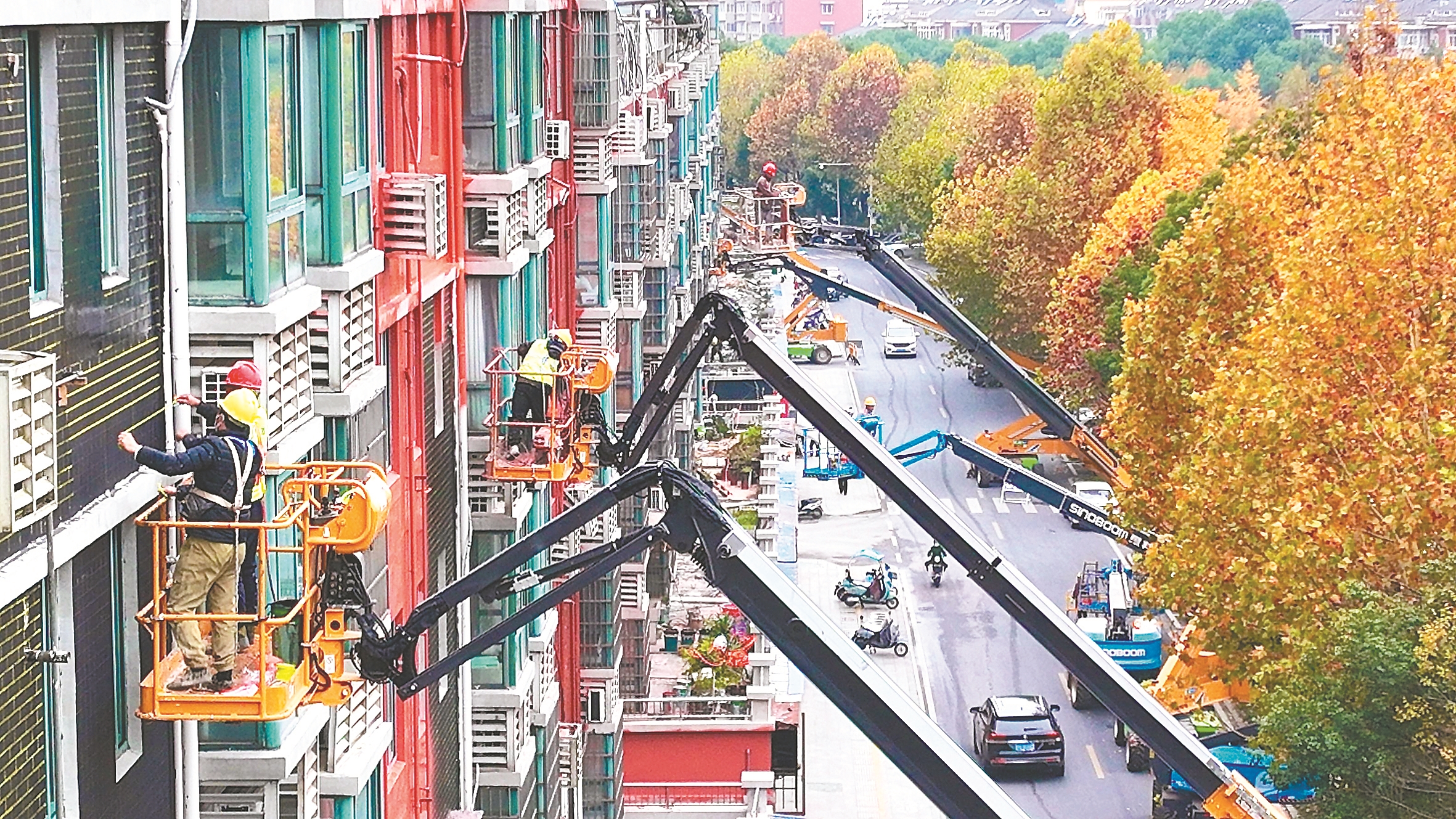 芜湖市繁昌区沿河南路阳光花园小区,施工人员在粉刷外墙,对老旧小区进行改造。本报通讯员 钱鸣 摄