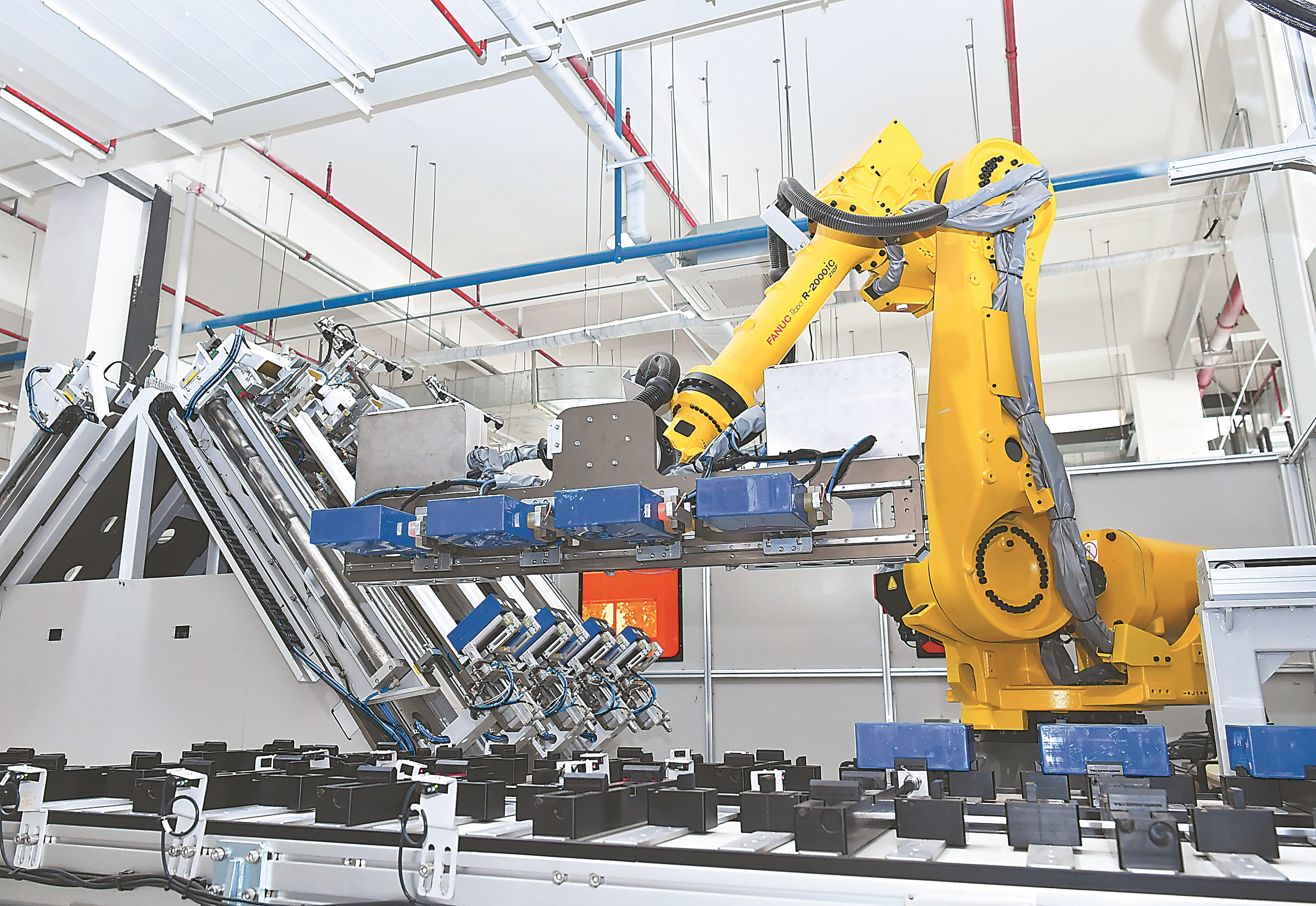 金派克新能源科技(淮北)有限公司动力电池生产车间,机器人在安装电池模组。本报记者 程兆 摄