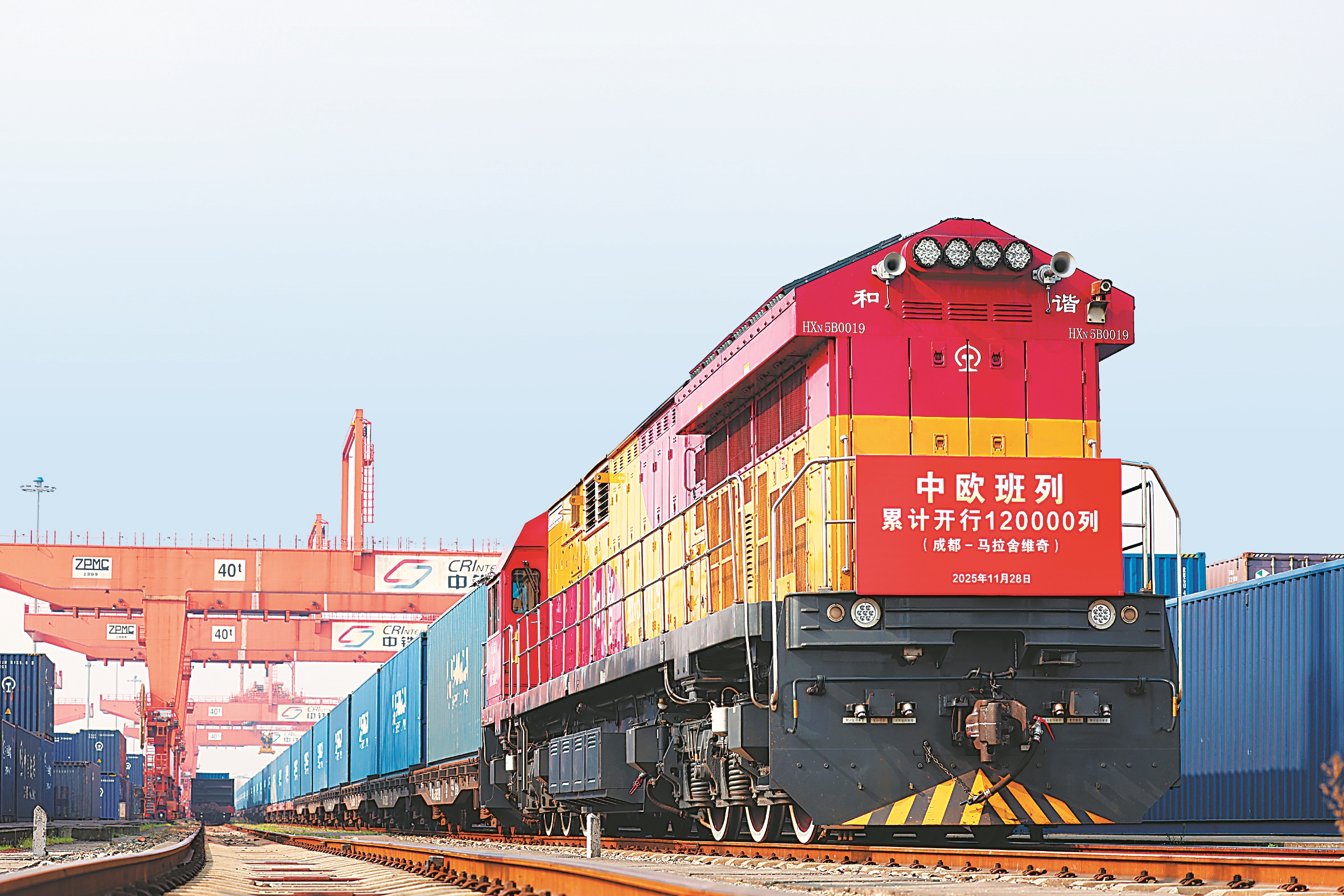 2025年11月28日12时13分,随着X8086次中欧班列从四川成都青白江区国际铁路港缓缓驶出,中欧班列累计开行突破12万列。成都国际铁路港供图
