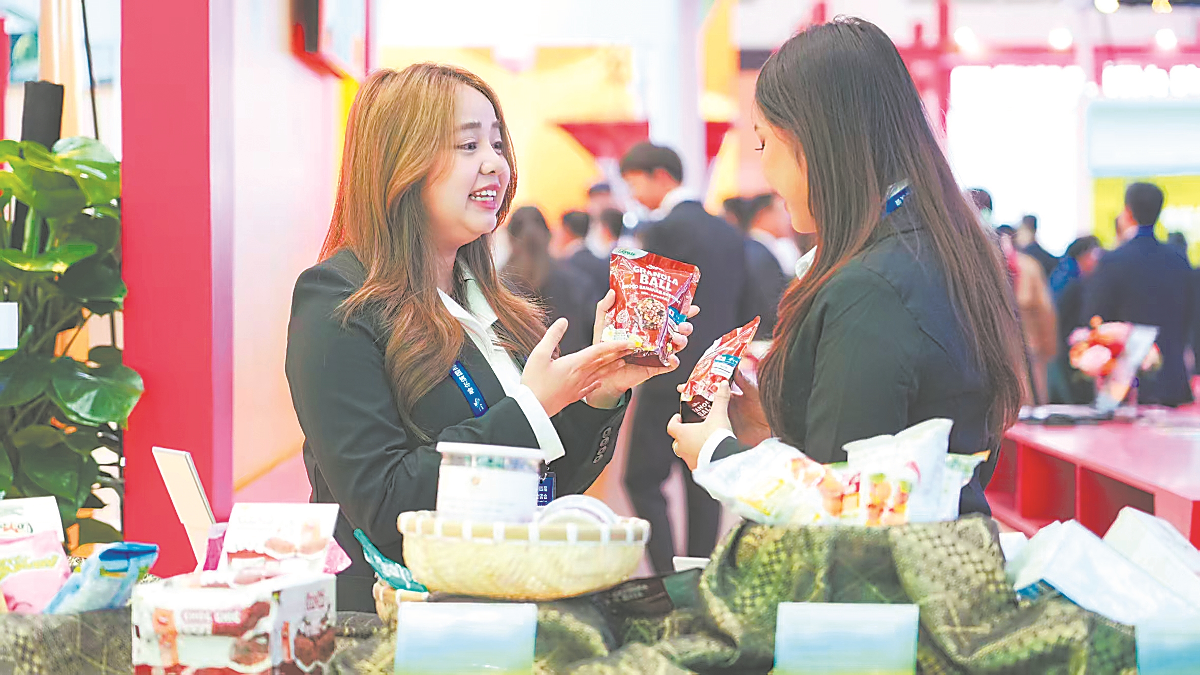 泰国客商在第三十四届哈尔滨国际经济贸易洽谈会上介绍展品。 黑龙江日报记者 刘心杨 摄