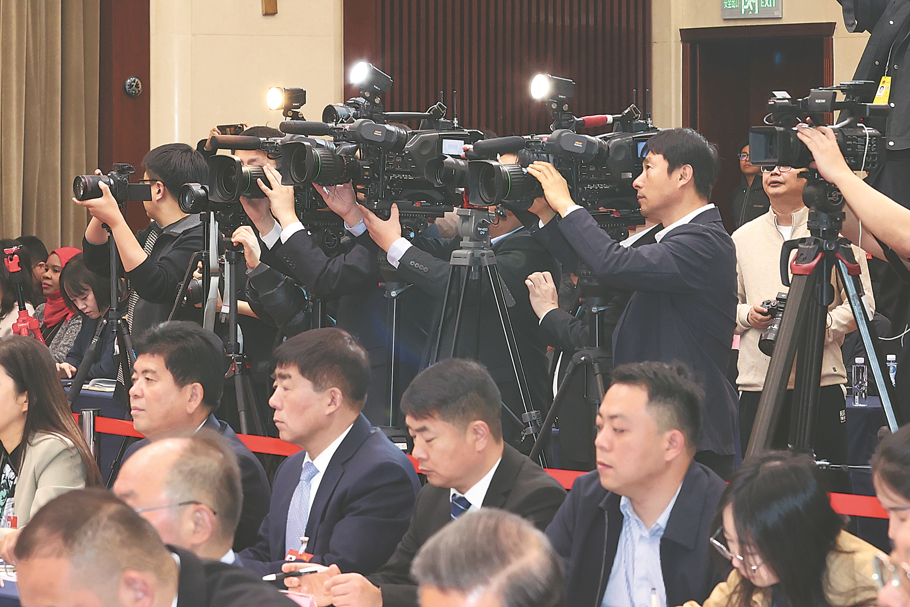 三月六日上午,安徽代表团住地会议厅里座无虚席,六十五家境内外媒体记者到会旁听与采访。本报记者 杨竹 摄