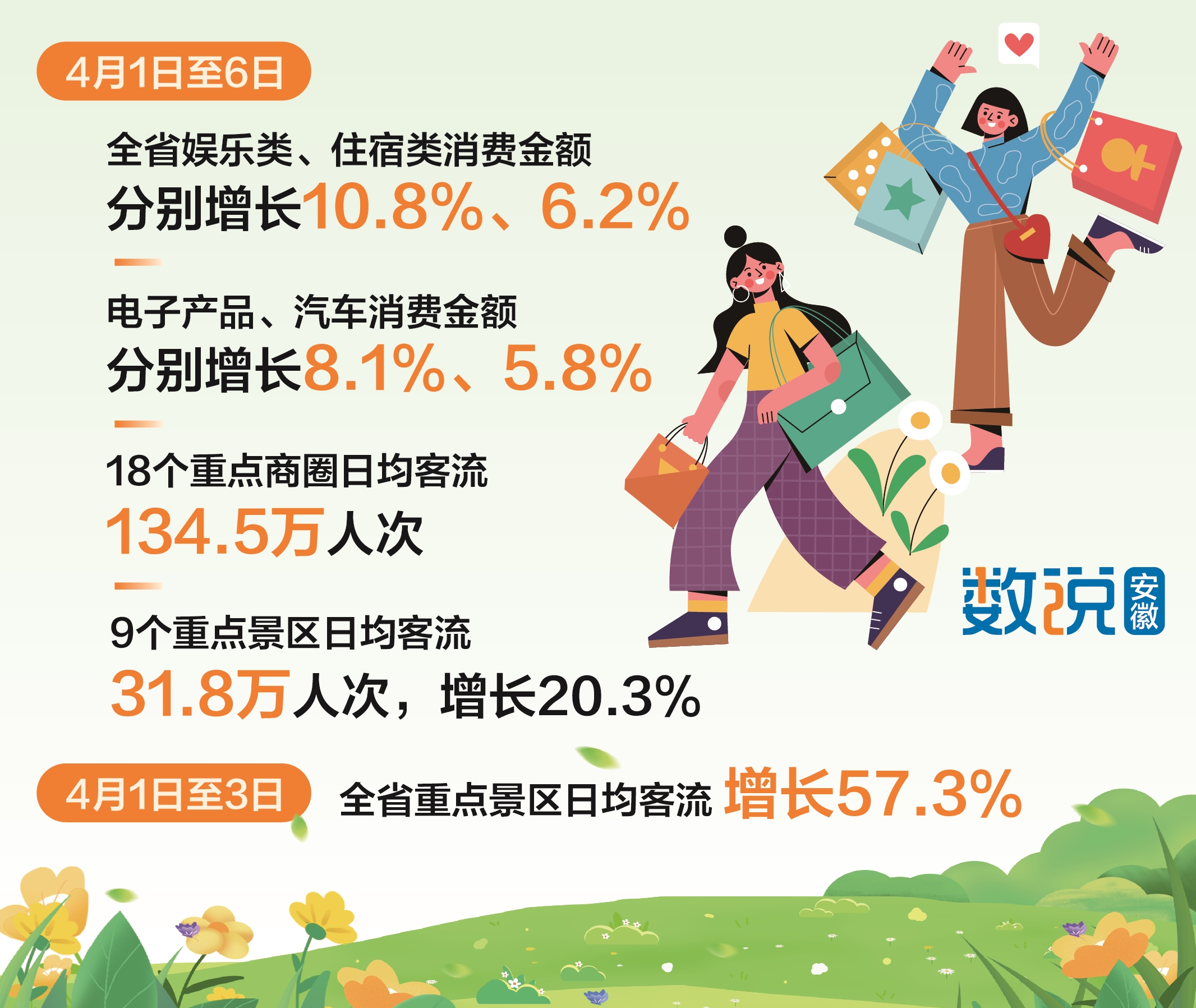 服务消费和智能消费较快增长。银联商务大数据显示,4月1日至6日,旅游出行增多,带动安徽全省娱乐类、住宿类消费表现亮眼,消费金额分别增长10.8%、6.2%;智能产品消费增长明显,电子产品、汽车消费金额分别增长8.1%、5.8%。