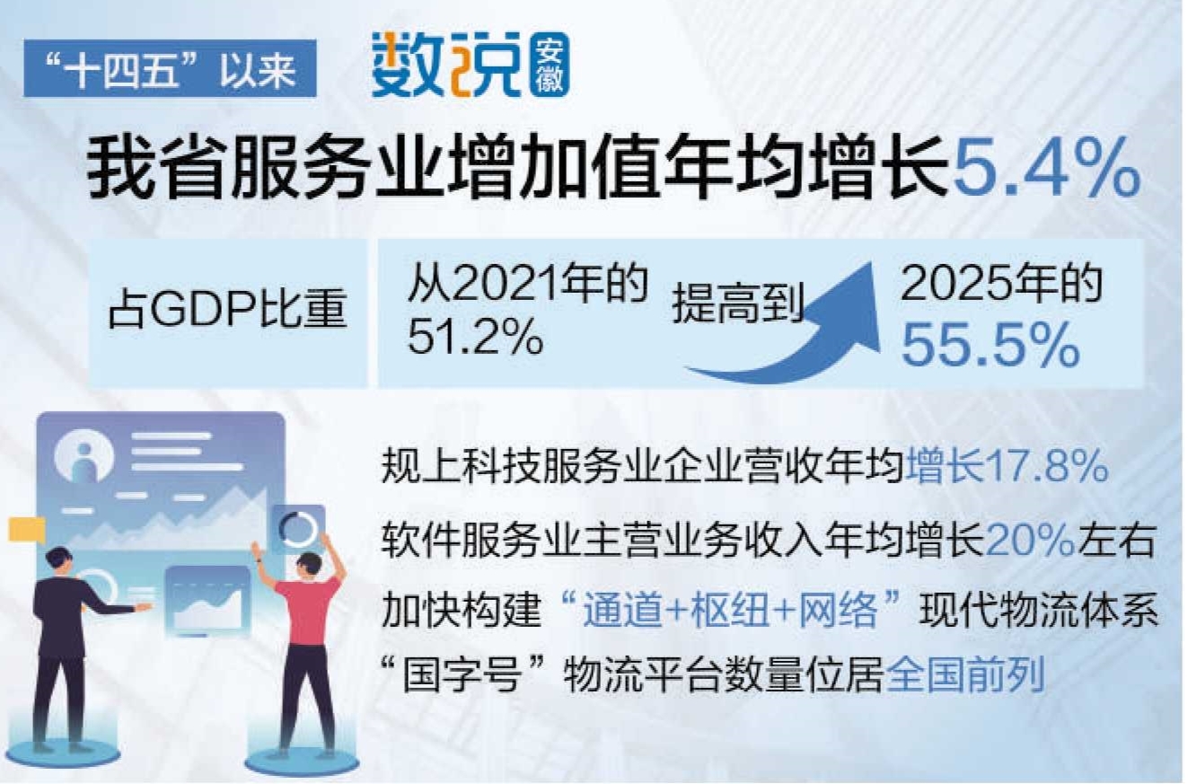 “十四五”以来,我省服务业增加值年均增长5.4%,占GDP比重从2021年的51.2%提高到2025年的55.5%。