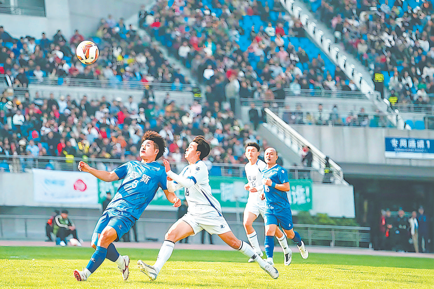 合肥城市足球联赛赛场上,球员们激烈拼抢。(合肥市体育局供图)