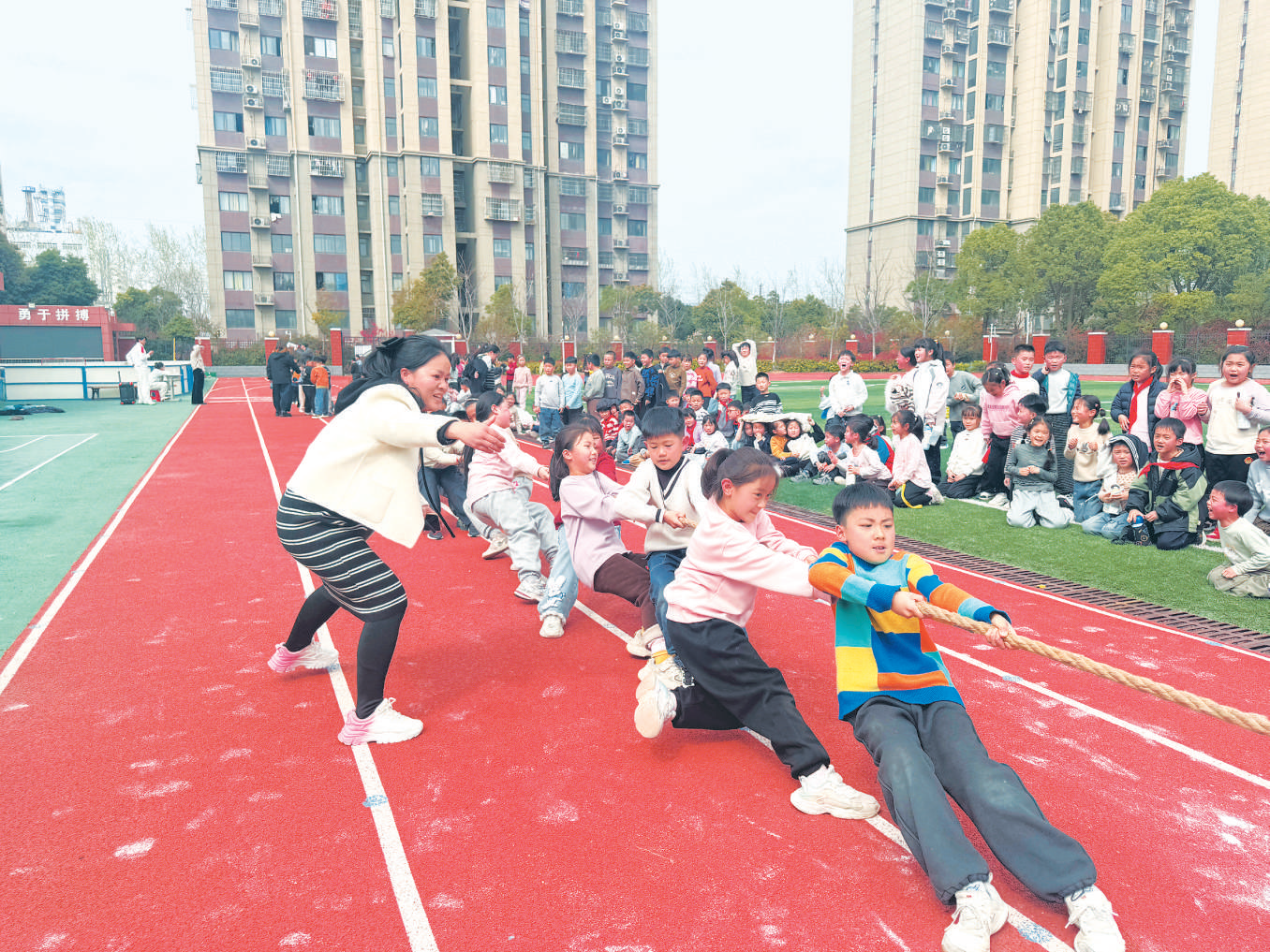 合肥市建平实验小学锦绣校区用拔河实现41个班级全员上阵,全校上千名学生同场参与、同心发力,一根绳子凝聚起整个校园的精气神。