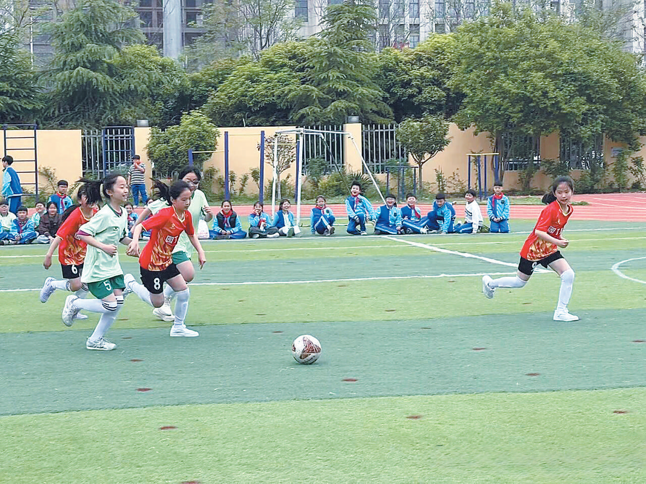 亳州园丁学校春季趣味运动会暨第九届足球联赛中,女足队员在球场上奋力拼搏。(受访者供图)