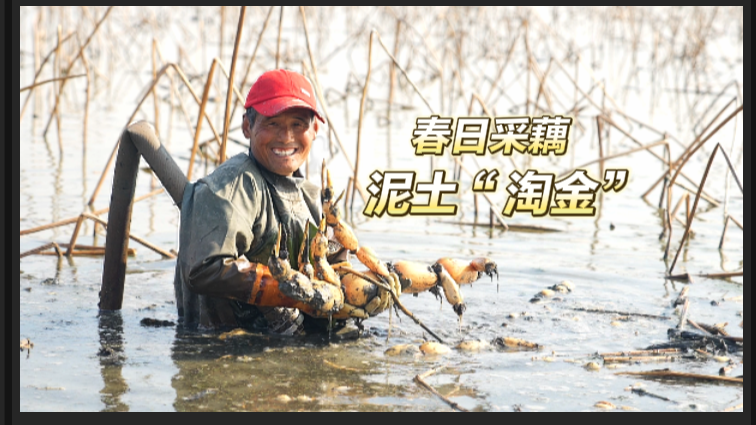 3月1日,铜陵市铜官区西湖镇新圩村的藕田里,工人们身着防水服正在泥土“淘金”、采收莲藕。