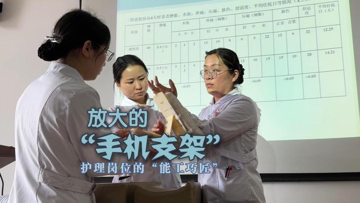 很多骨折患者康复时需要使用抬高法,可减少手术后相关并发症。但大都是利用枕头和笨重的垫子作为抬高工具,角度受限也不方便。为此,安徽省第二人民医院骨科一病区的护士长王伟风和团队从手机支架中获得灵感,设计制作起了放大版的可调节抬高支架。通过临床测试后,这个低成本易携带的支架得到了患者的认可。目前,她们还准备开发能够承载更大重量的下肢支架,并希望能拓展到更多的使用场景中。