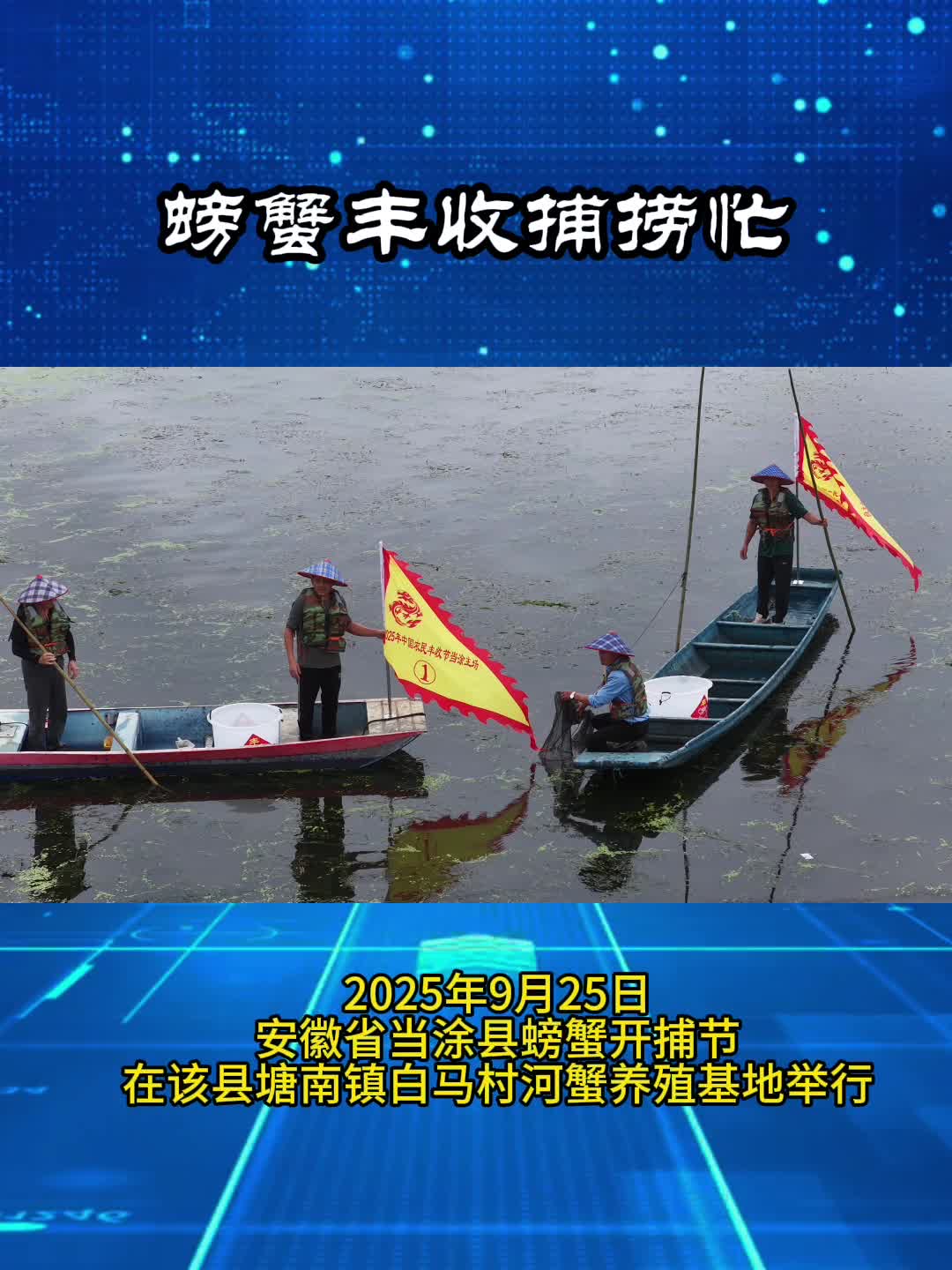 9月25日,安徽省当涂县螃蟹开捕节在塘南镇白马村河蟹养殖基地举行。作为被中国渔业协会授予“中国生态养蟹第一县”称号的当涂县螃蟹养殖面积近26万亩,预计产量超1.8万吨,产值可达18亿元。