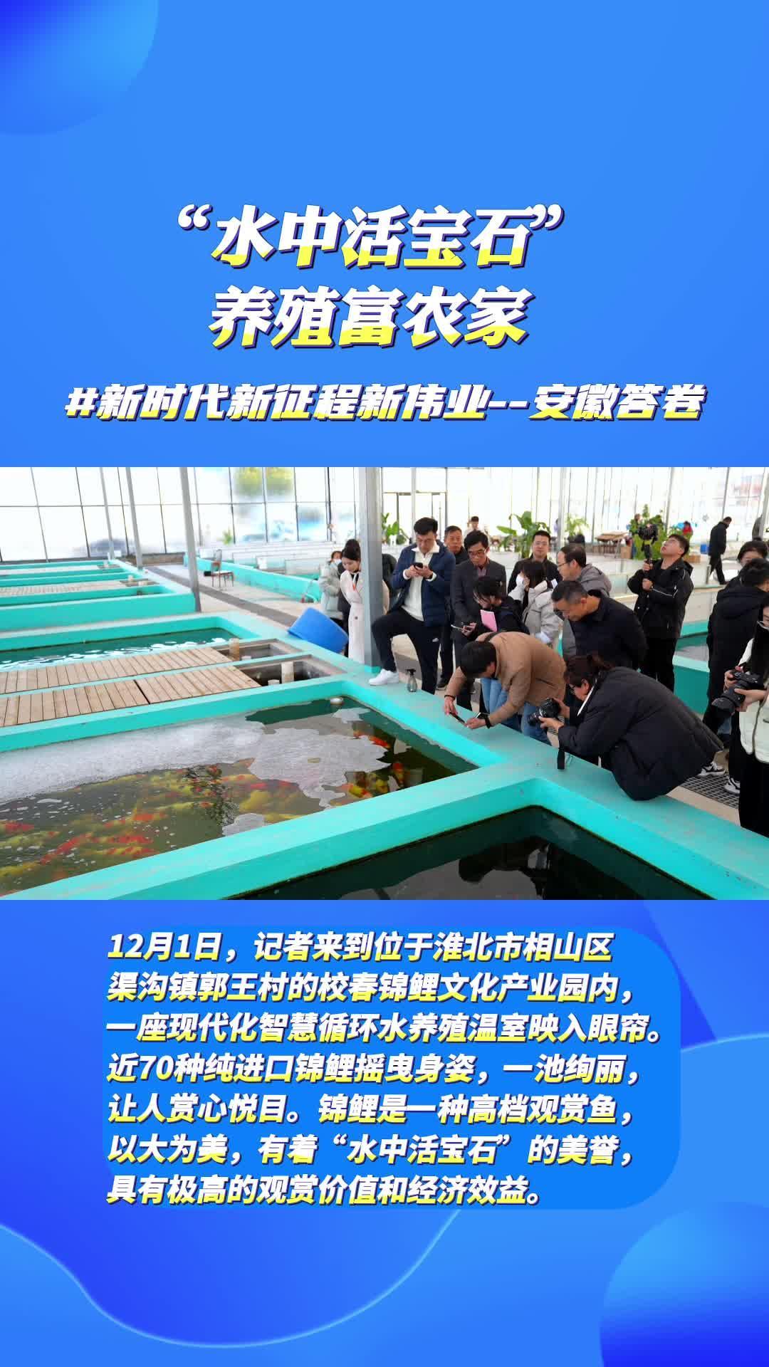 12月1日,记者来到位于淮北市相山区渠沟镇郭王村的校春锦鲤文化产业园内,一座现代化智慧循环水养殖温室映入眼帘。近70种纯进口锦鲤摇曳身姿,一池绚丽,让人赏心悦目。锦鲤是一种高档观赏鱼,以大为美,有着“水中活宝石”的美誉,具有极高的观赏价值和经济效益。